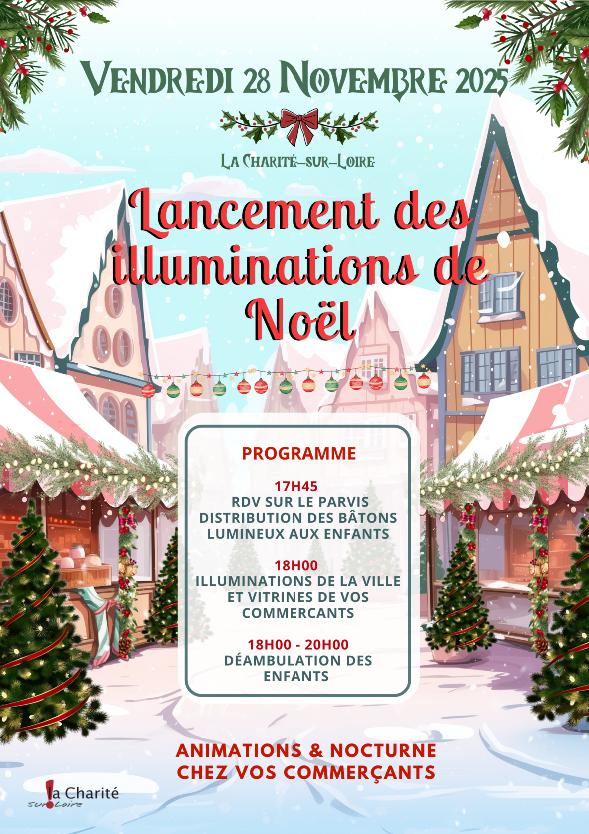 Venez participer à l’illumination des guirlandes de rue, et découvrez les vitrines de vos commerçants embellies pour Noel ! Pour l’occasion certains resteront ouverts plus tardivement, alors profitez de ce moment pour faires vos achats de noël.