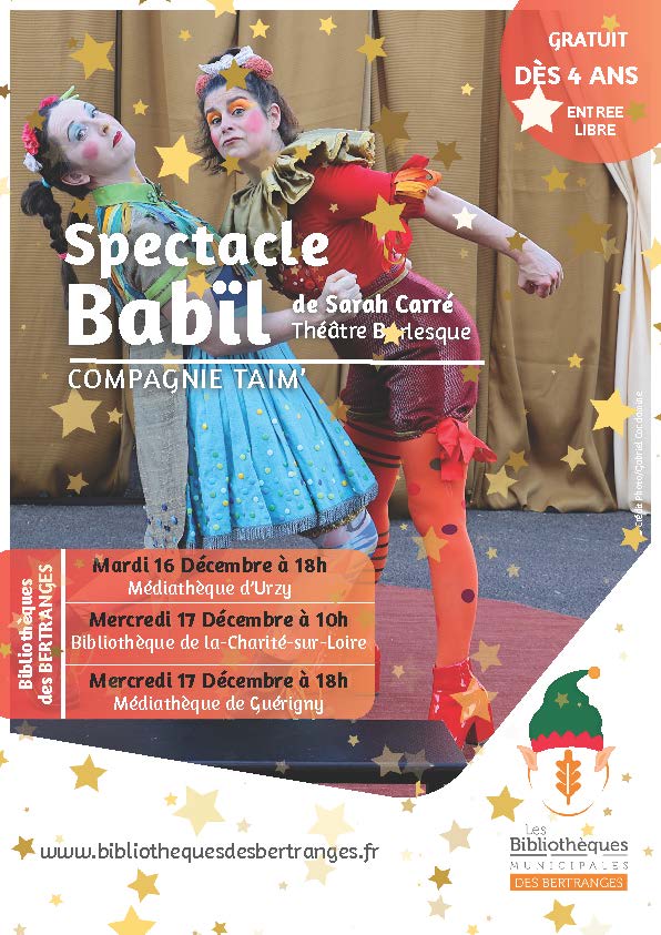 Les bibliothèques fêtent Noël Un spectacle burlesque pour les grands et les petits dans les bibliothèques des Bertranges Les bibliothèques des Bertranges fêtent Noël ???? Spectacle Babïl par la compagnie TAIM’ un spectacle burlesque pour les grands et les petits Mardi 16 décembre • Médiathèque d’Urzy à 18h Mercredi 17 décembre • Bibliothèque de la …