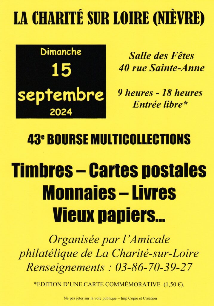 Bourse aux timbres, cartes postales, livres, monnaies, vieux papiers pour trouver les pièces manquant à votre collection. Organisée par l'Amicale philatélique de La Charité 25 négociants environ. Entrée libre (possibilité d'acquérir la carte postale commémorative). Buvette avec petite restauration