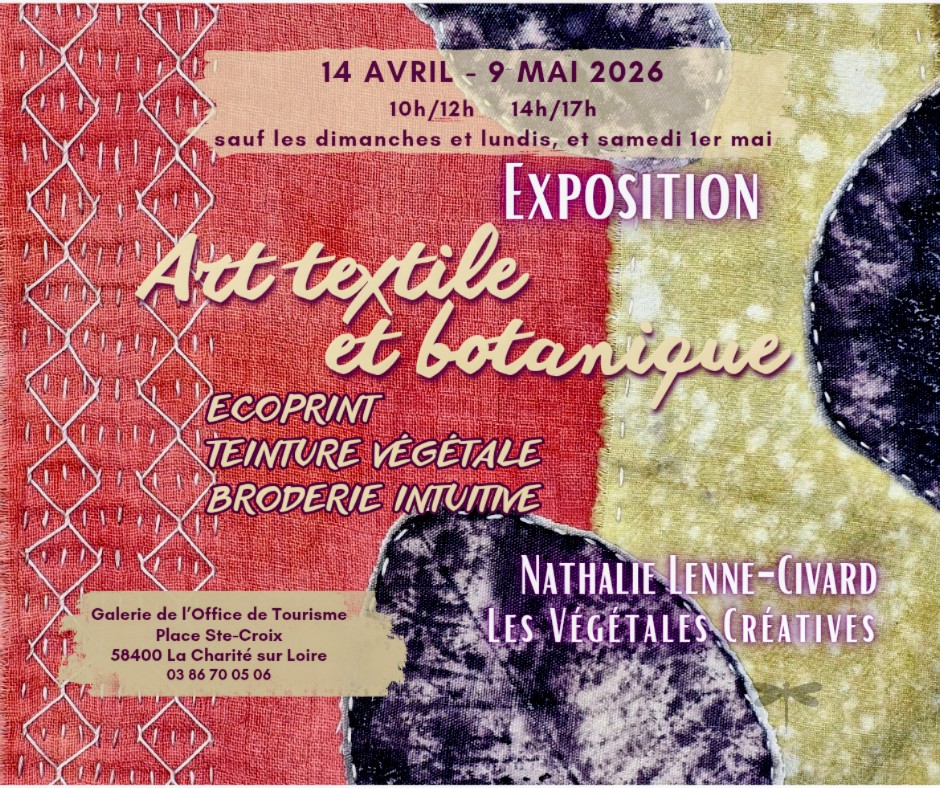 Le monde végétal a toujours été une source d’inspiration artistique. Les plantes ont un impact significatif sur notre bien-être émotionnel et mental, ce qui en fait les alliées puissantes de nos voyages créatifs. C’est un voyage magique que propose Nathalie Lenne-Civard qui, de la Nièvre à l’Inde du Sud, a exploré les ressources végétales pour créer des tableaux textiles à l’aide de techniques connues depuis toujours que sont la teinture végétale et l'impression botanique ou ecoprint. En aventurière de la vie, amoureuse des plantes et de tous leurs bienfaits, elle a commencé son exploration de leurs vertus tinctoriales, renouant également avec l’art de la broderie transmis par sa grand-mère ukrainienne. Il en résulte des créations qui mêlent différentes techniques d’impression végétale, rehaussées de points intuitifs sur des tissus qu’elle teint elle-même avec plantes, feuilles et écorces issues de ses cueillettes. Afin de transmettre ses connaissances et ses expériences, elle organise des ateliers d’initiation au sein du collectif « Les Végétales Créatives ». Nathalie Lenne-Civard est connue principalement à la Charité sur Loire pour son hôtel Mille et une Feuilles acquis en 2003. Mais elle a d’autres casquettes plus discrètes : celle de naturopathe depuis 2018 et celle plus récente d’artiste-photographe sous l’acronyme nlcvd avec plusieurs expositions collectives, à la galerie l’Artisterie en 2021, au Prieuré en 2022, à la Charité sur Loire, et à Neuvy Deux-Clochers en 2025.