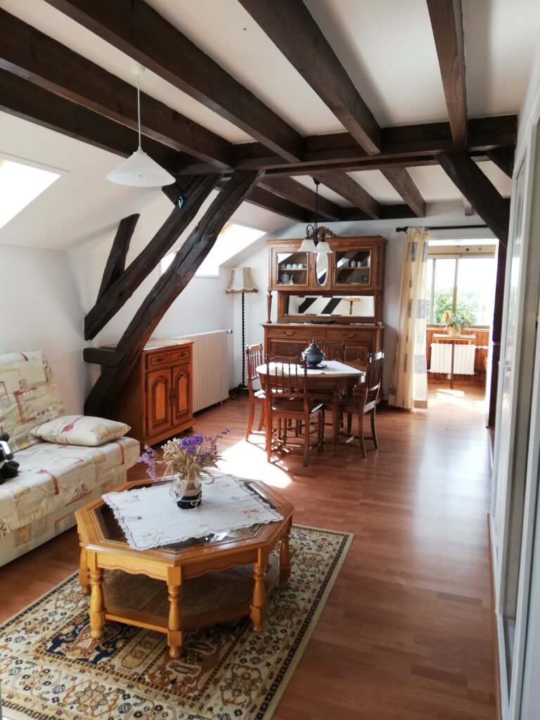 Belle pièce de vie lumineuse et chaleureuse avec poutres apparentes, aménagée avec un coin salon (canapé convertible 2 places, tv) coin repas pour 4 personnes et une cuisine entièrement équipée (réfrigérateur, plaques électriques, micro-ondes, petit four, cafetière, grille pain et bouilloire), salle d'eau avec douche et vasque, un wc, une chambre mansardée avec lit double, placards muraux. Le petit plus, une belle véranda donnant vue sur la Loire pour les petits déjeuners en amoureux. Nous tenons à disposition tout le linge de maison (draps, couettes, couvertures, drap de bains et serviettes de toilettes). Possibilité de stationner voiture ou moto à l'abris dans garage, cour fermée pour permettre aux enfants de jouer en toute tranquillité. Vous pourrez effectuer de belles randonnées en vélo le long de la Loire, à pied sur le chemin de St Jacques de Compostelle, en canoë sur la Loire, en bateau sur le canal latéral à la Loire, et biens autres activités.